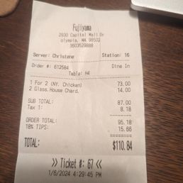 Food was good. Service was good. As far as ambiance, you should know what you're getting given the strip mall it's located at, so no surprise there. Prices are pretty high, but welcome to the new USA. But if you're craving hibachi, or you have a birthday celebration, this place will do.
